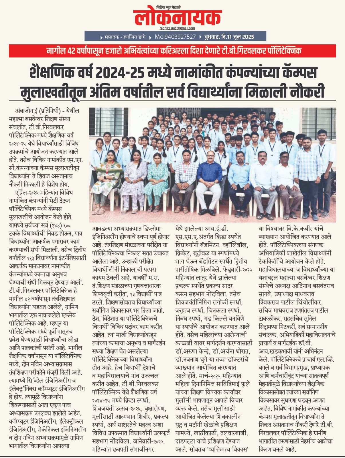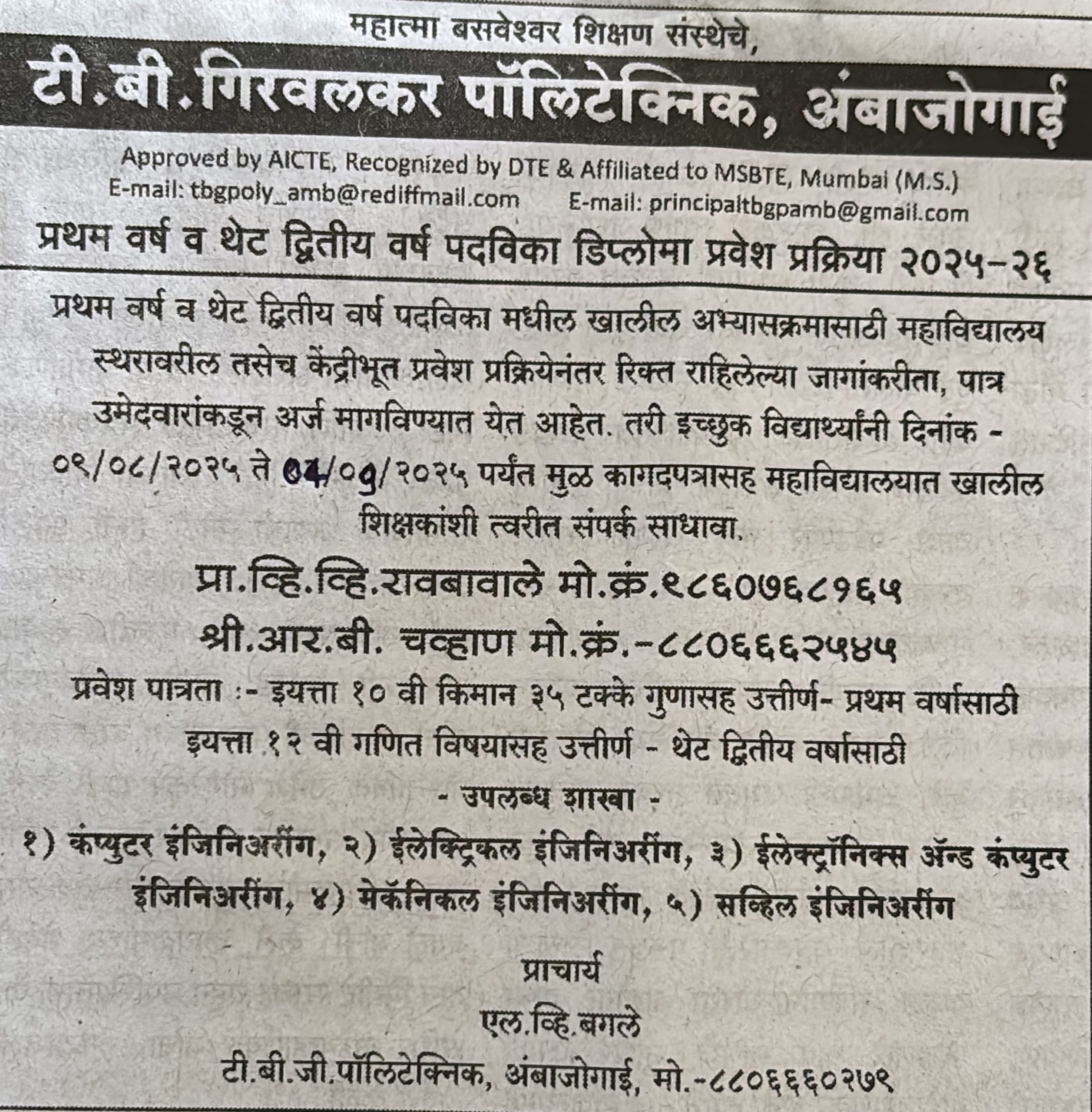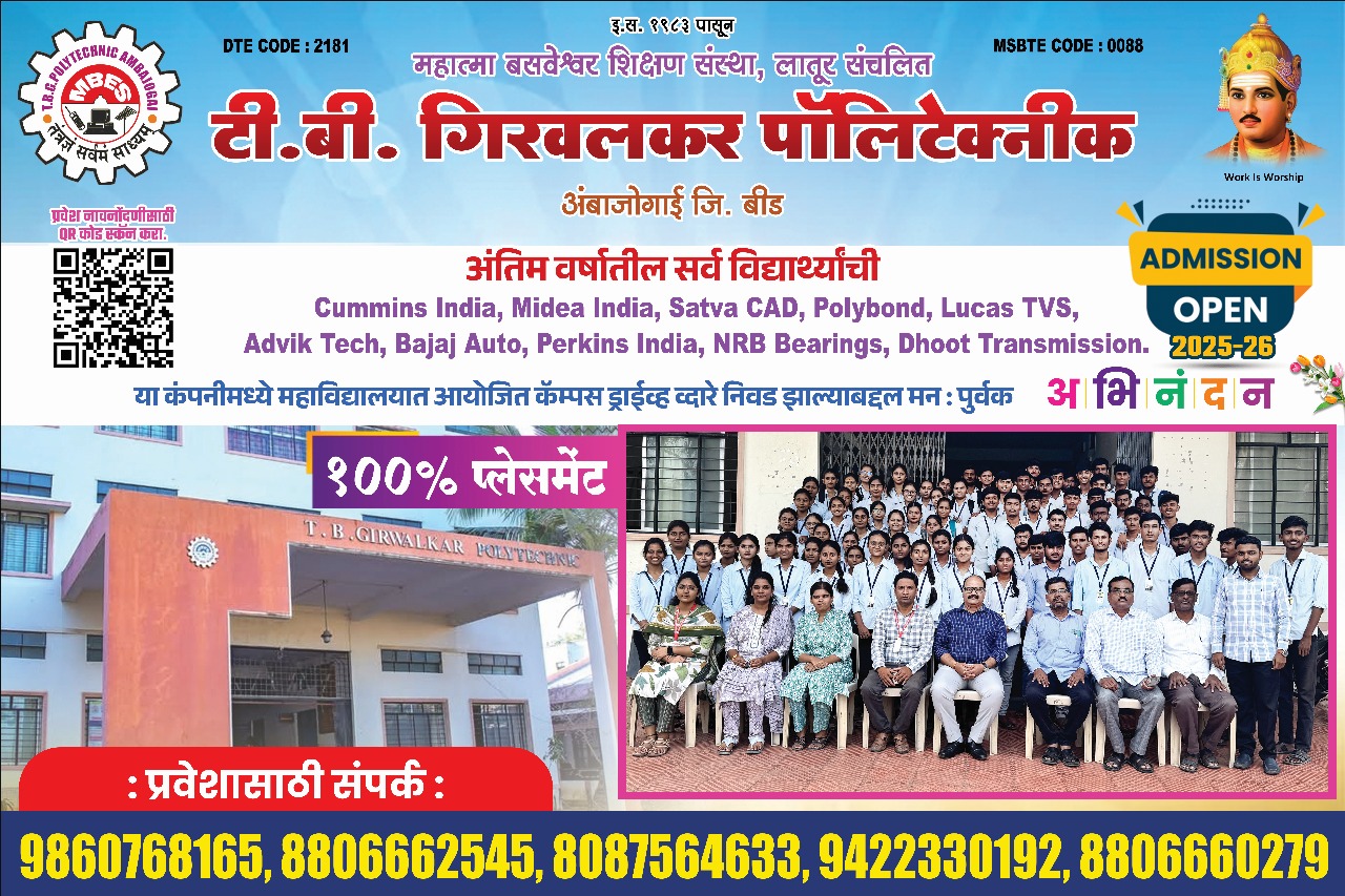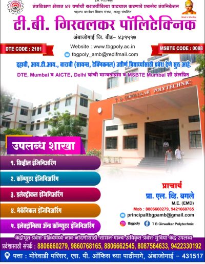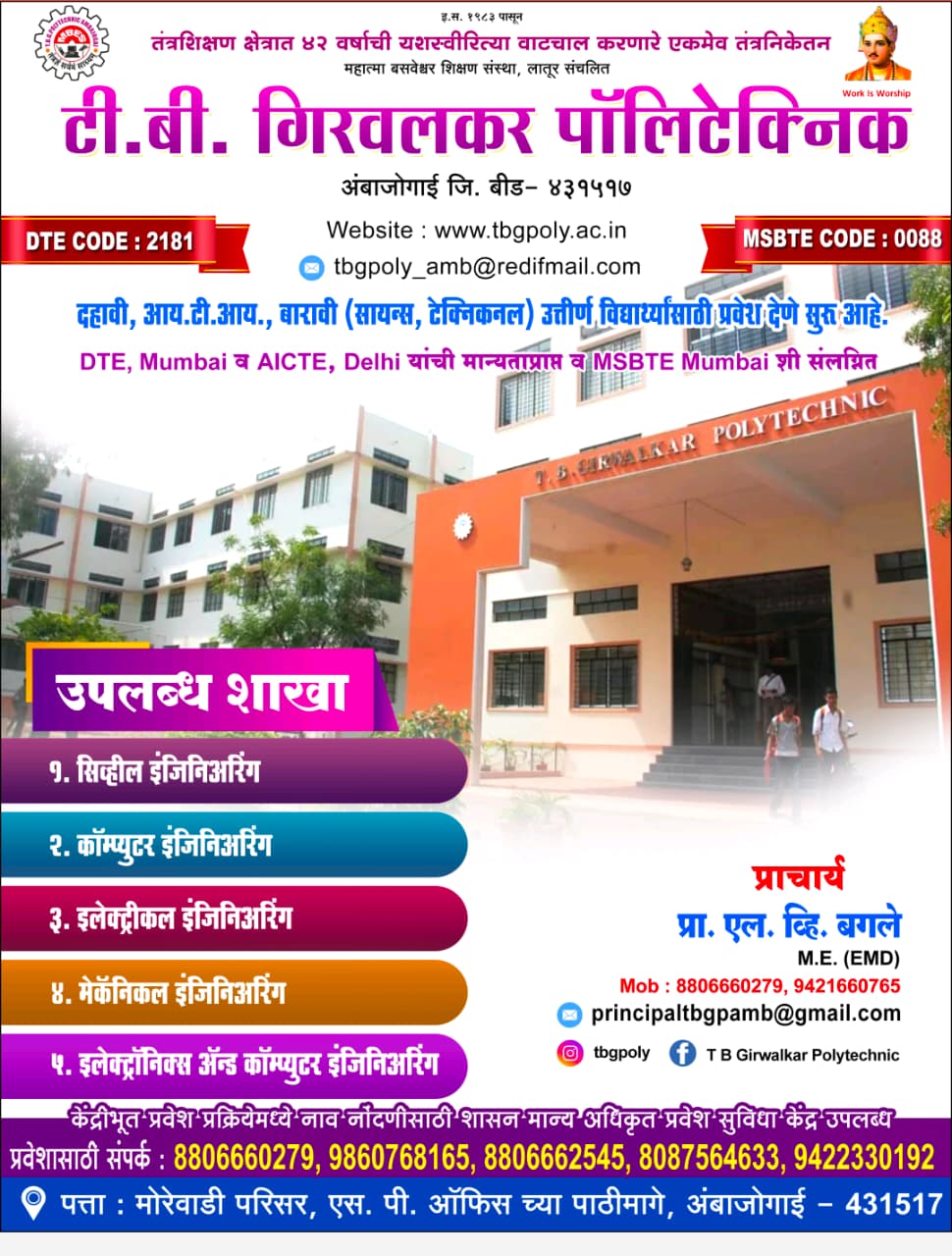 T.B. Girwalkar Polytechnic, Ambajogai Shall be a self-reliant, leading and the best technical educational Institute to develop young minds in a learning environment of high academic ambience by synergizing spiritual values and technological competence.