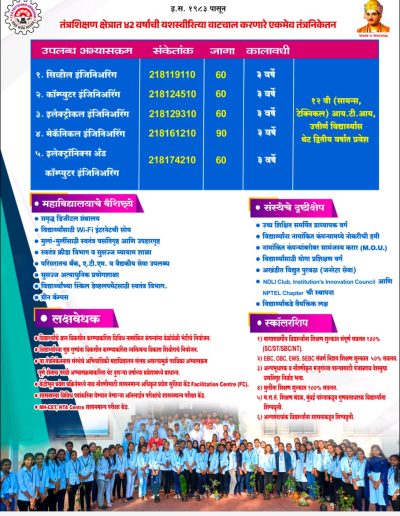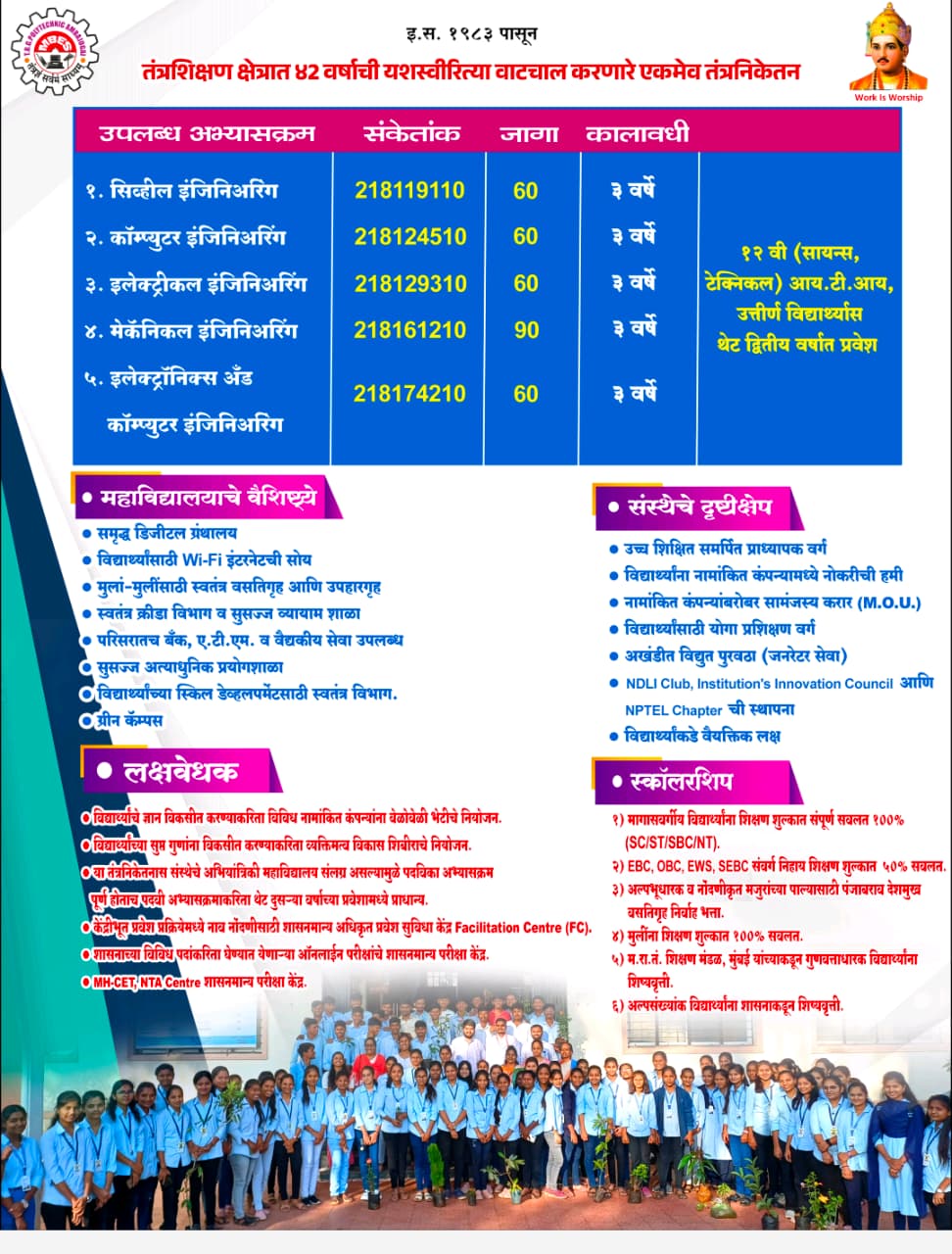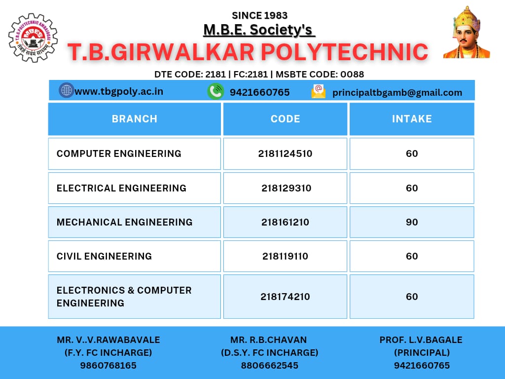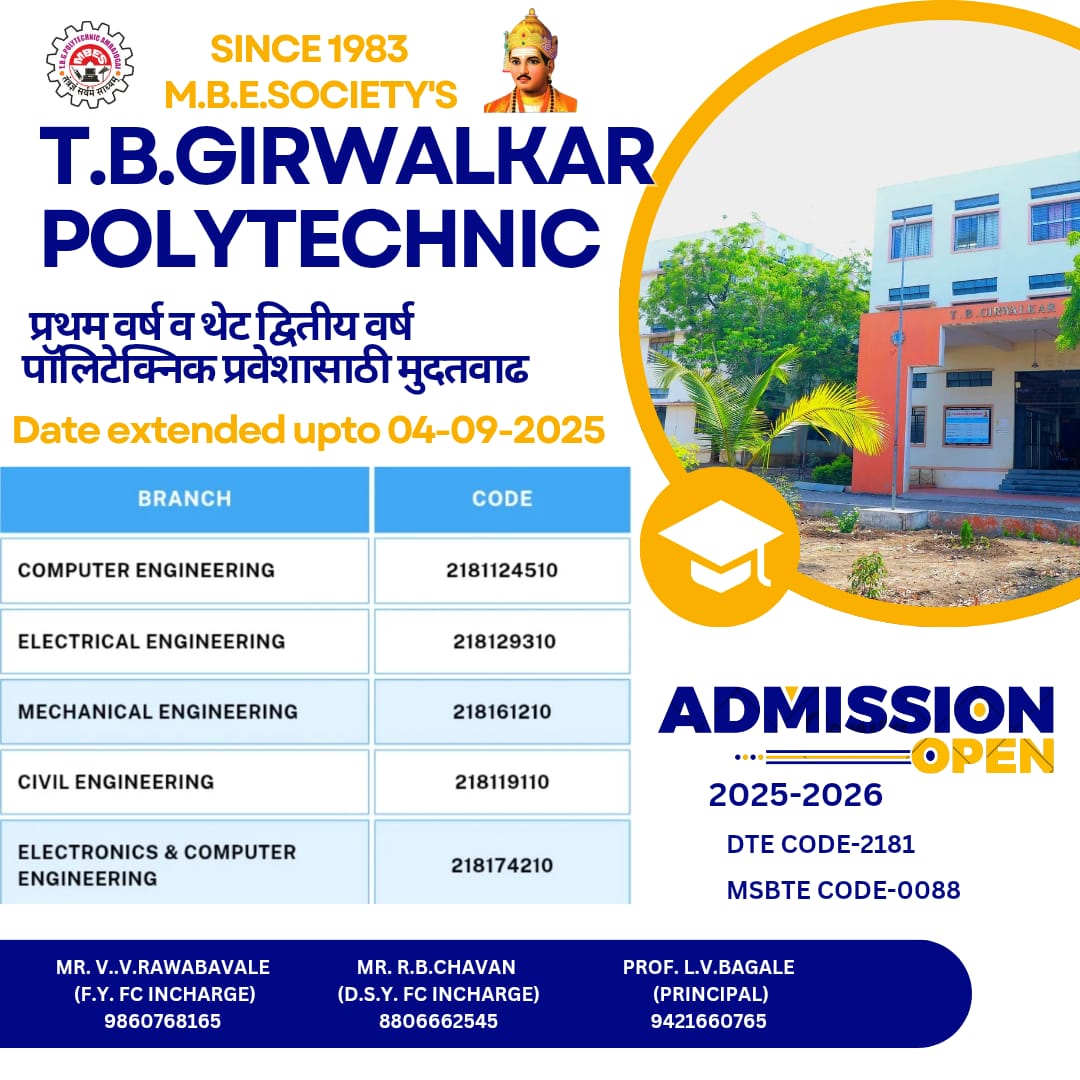 Founded in the academic year 1983, T.B. Girwalkar Polytechnic was established with the aim of harmonizing the wisdom of ancient Indian traditions with cutting-edge technological education. Dedicated to delivering high-quality and holistic technical training, the institute molds students into well-rounded technocrats. It is affiliated with the Maharashtra State Board of Technical Education, Mumbai, and recognized by the All India Council for Technical Education (AICTE), New Delhi.